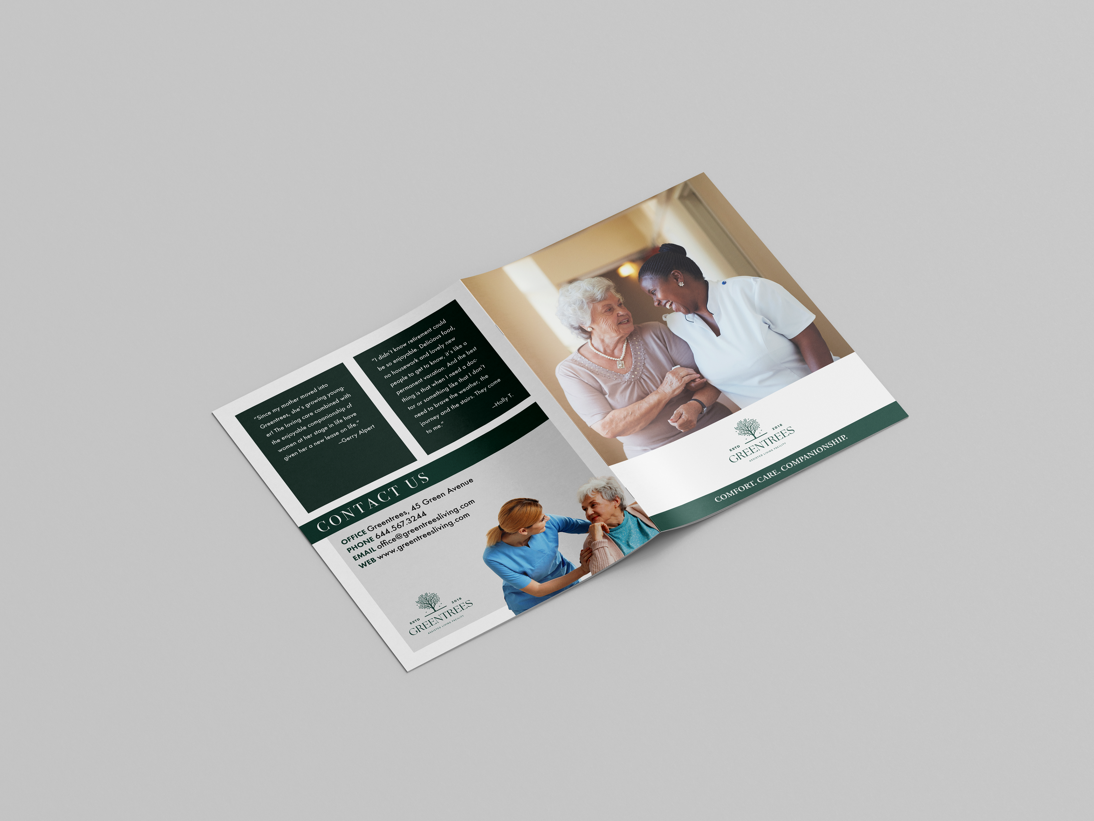 For Greentrees Assisted Living, I designed a brochure that reflects a commitment to comfort, care, and independence. Using a soothing palette of forest green and neutral tones, the brochure conveys a sense of professionalism and reliability while remaining approachable. The design balances essential information with an inviting layout, emphasizing the facility’s focus on providing companionship and a higher level of independence than traditional nursing homes. The unique challenge was perfecting the layout to ensure all information was presented clearly and effectively, creating a brochure that resonates with both prospective residents and their families.